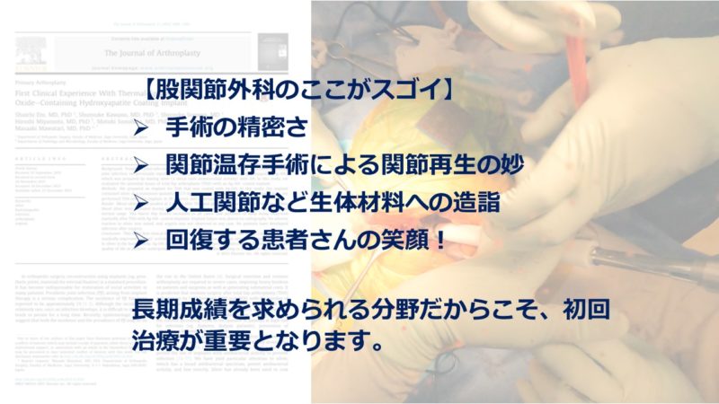 整形外科治療の中心的な対象疾患が股関節脱臼だった頃より、“股関節を制するものは整形外科を制する”と言われていたように股関節疾患は、患者さんのQOLに大きく影響する重要な分野です。また、人工股関節置換術は20世紀に最も成功を納めた手術術式の一つであり、術式やインプラントは日進月歩の改良を加えなが進歩し続けております。