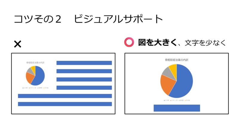 スライドは図やグラフが主人公です。文字は少なくしましょう。