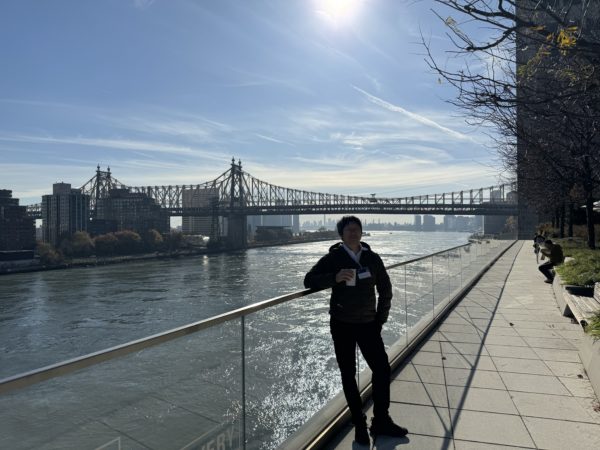 写真はResearch Teamから「写真撮ってやるからポーズ取れ」という振りを受けてイーストリバーとQueensboro橋の前でカッコつける筆者。