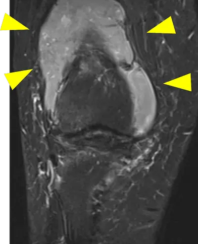 [50代 膝関節内軟部腫瘍] 膝関節をあけ直視下に腫瘍を辺縁切除施行。術後再発なく経過している。