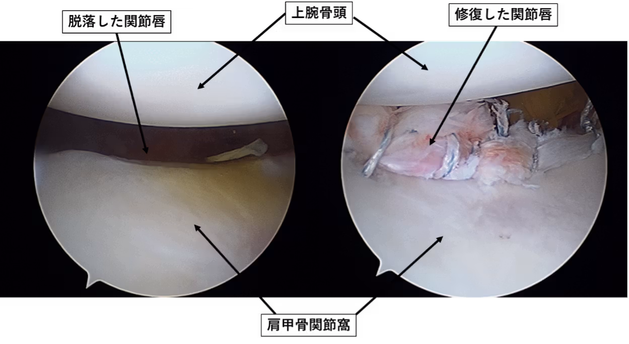 肩関節は非常に不安定な関節で人間の関節の中で最も脱臼しやすい関節です。若年(10代、20代)で初回脱臼をおこすと高率で反復性に移行します。反復性になると、日常生活に支障をきたしたり、将来的に変形性関節症を引き起こす危険性が高くなります。脱臼を制動している関節包と関節上腕靱帯が脱臼の際に靱帯の根元である関節唇ごと肩甲骨関節窩(受け皿)から剥がれています。関節窩にアンカーという糸付きのネジを挿入して、関節唇・関節上腕靱帯に糸をかけて関節窩に縫縮します。術後は三角巾固定を3週間程度おこない、6週間程度外旋動作は禁止します。日常生活は2~3ヶ月で復帰、スポーツ復帰は種目によりますが術後6ヶ月程度で復帰となります。